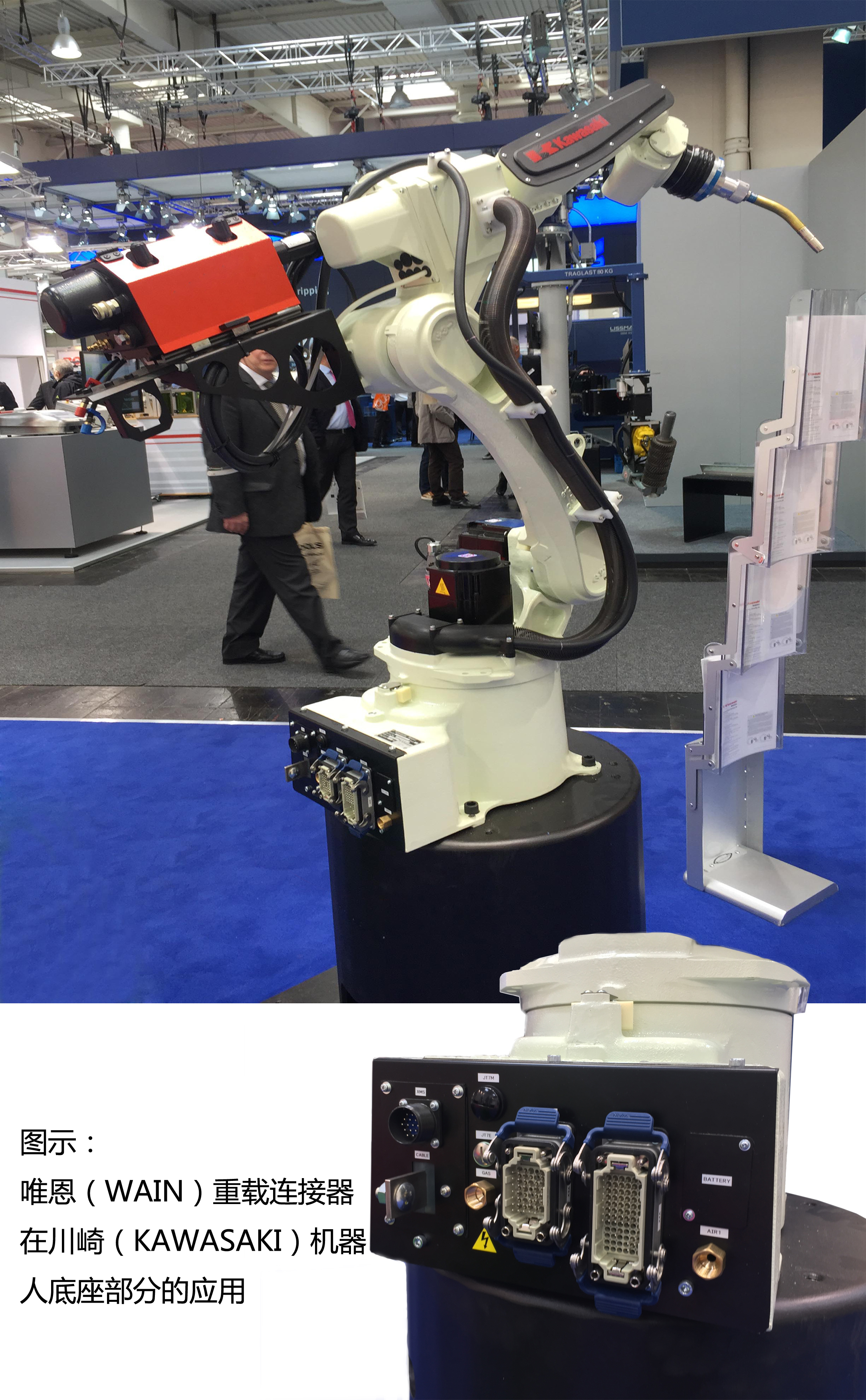 川崎(KAWASAKI)機器人以高度的綜合技術實力,以提供高功能,高質(zhì)量,高安全性的產(chǎn)品以及服務為使命,得到社會廣大顧客的高度信賴,主要行業(yè)有點膠、點焊、弧焊、裝配、汽車生產(chǎn)流水線、碼垛、涂裝、搬運、上下料、分揀等等。而此次2015 HANNOVER 德國漢諾威展會上,川崎機器人不僅展示了碼垛、搬運、點焊機器人等,更展示了唯恩(WAIN)重載連接器在川崎(KAWASAKI)機器人上的應用,通過川崎機器人已有的25年成功經(jīng)驗,選擇唯恩(WAIN)重載連接器作為他們的長期合作伙伴,是對唯恩(WAIN)品牌的認可。
