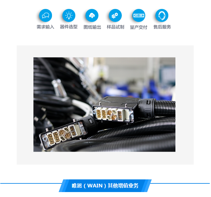 唯恩不僅提供行業(yè)標(biāo)準(zhǔn)連接器的解決方案,也為客戶提供******定制的線束裝配業(yè)務(wù)。